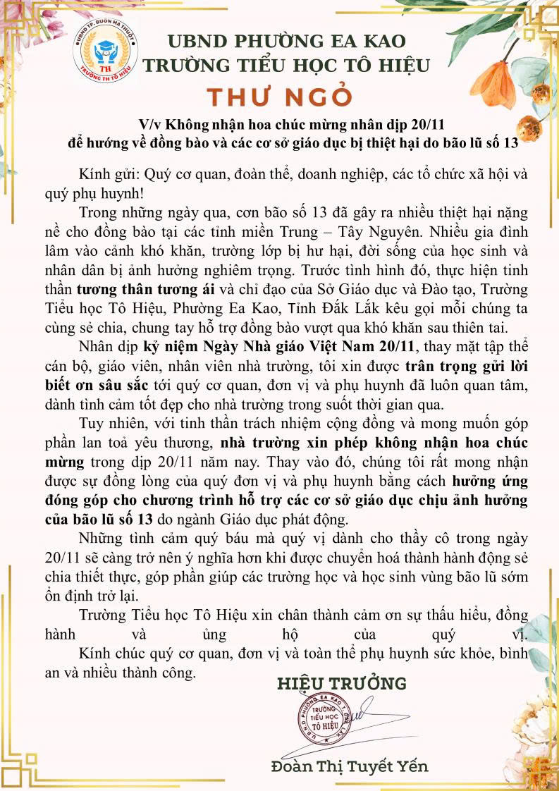 📧 THƯ NGỎ ĐẶC BIỆT: V/v Không nhận hoa chúc mừng nhân dịp 20/11 để hướng về đồng bào và các cơ sở giáo dục bị thiệt hại do bão lũ số 13