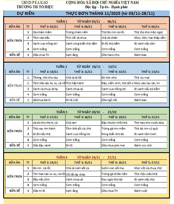 Nhằm đảm bảo chế độ dinh dưỡng hợp lý, giúp học sinh có những bữa ăn ngon miệng, đủ chất và an toàn vệ sinh thực phẩm, Trường Tiểu học Tô Hiệu thông báo thực đơn bán trú tháng 11 năm 2025 (từ ngày 03/11 đến 28/11/2025) như sau: