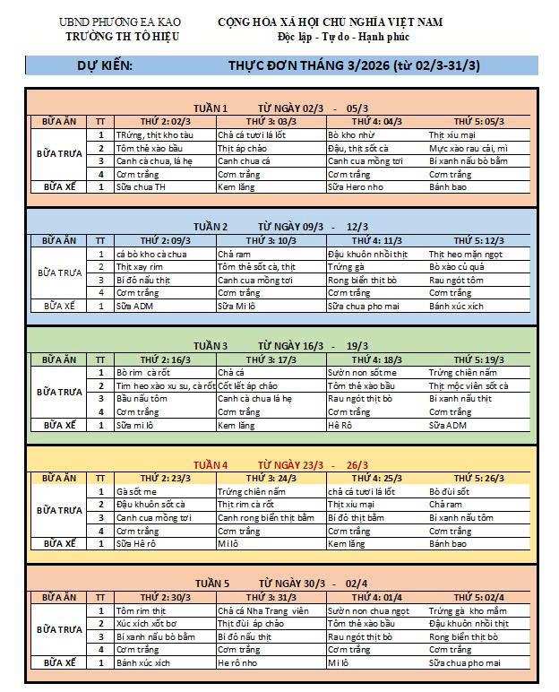 Nhằm đảm bảo sức khỏe, sự phát triển toàn diện và tạo nguồn năng lượng tích cực cho các em học sinh trong suốt ngày học tập, Trường Tiểu học Tô Hiệu trân trọng thông báo thực đơn bán trú tháng 3 năm 2026 (từ ngày 02/3 đến 31/3/2026) như sau: